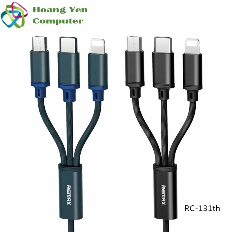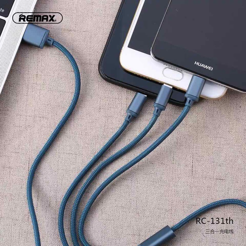 Cáp Remax 3 Đầu RC-131TH về mặt thiết kế không có quá nhiều đặc điểm chi tiết cầu kì. Cáp chỉ được thiết kế đơn giản với một đầu USB và 3 đầu cáp lightning, micro USB và Type-C. Ở chính giữa dây cáp, nhà sản xuất thiết kế thêm một mối giữ cho 3 đầu cáp của chiếc cáp này, mục đích chính để 3 đầu dây này không bị rối và thuận tiện hơn khi sử dụng.