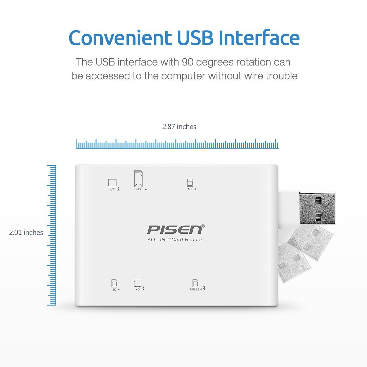 Đầu đọc thẻ nhớ đa năng PISEN Reader II (Trắng) đọc được hầu hết tất cả các loại thẻ nhớ thông dụng hiện nay với 6 khe cắm thẻ: 1. SD/SDHC; 2. MS/MS DUO/MS Pro; 3. Micro SD/Micro SDHC; 4. CF; 5. XD; 6. M2