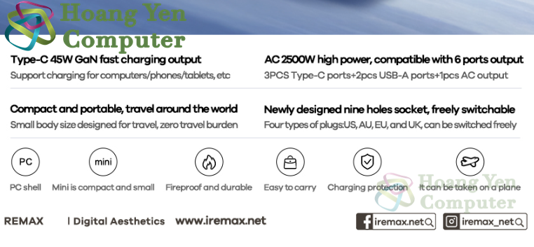 Ổ Cắm Chuyển Đổi Remax CM06, 3 Cổng Type-C + 2 USB + 1 AC - Đa Năng, Tiện Lợi - Hoàng Yến Computer