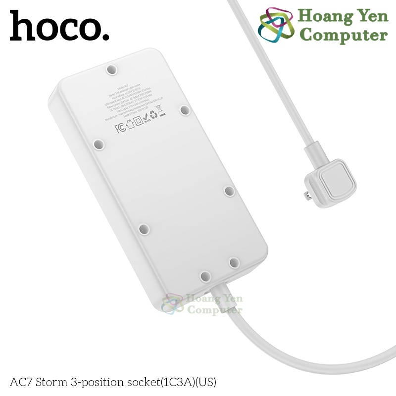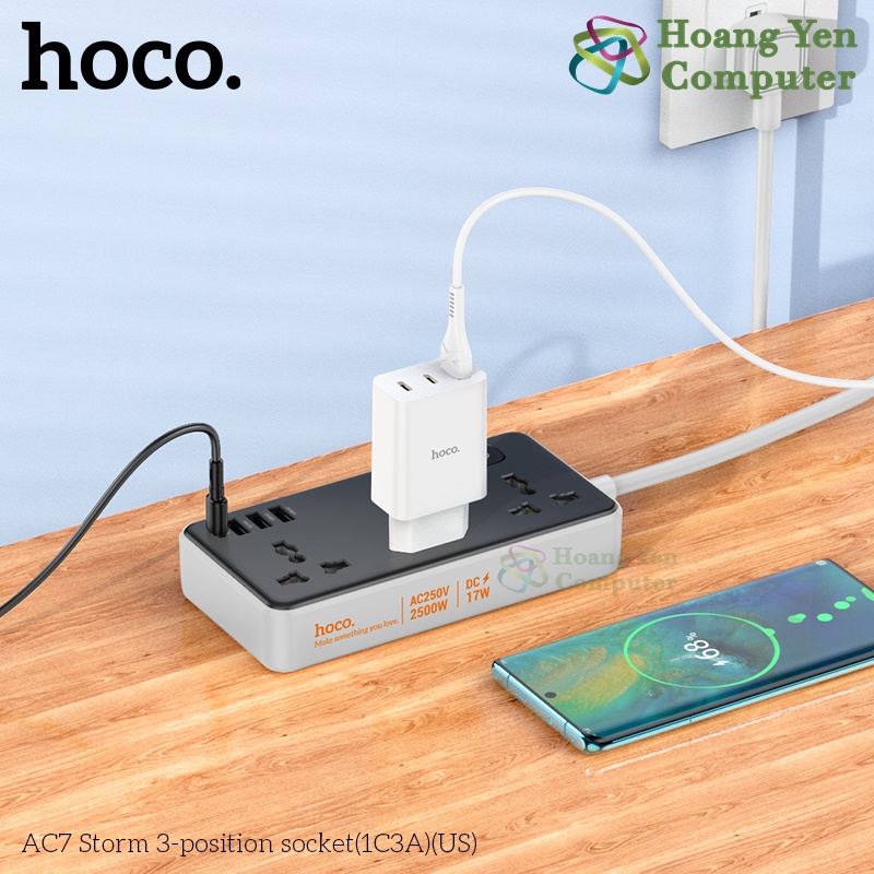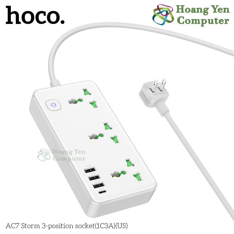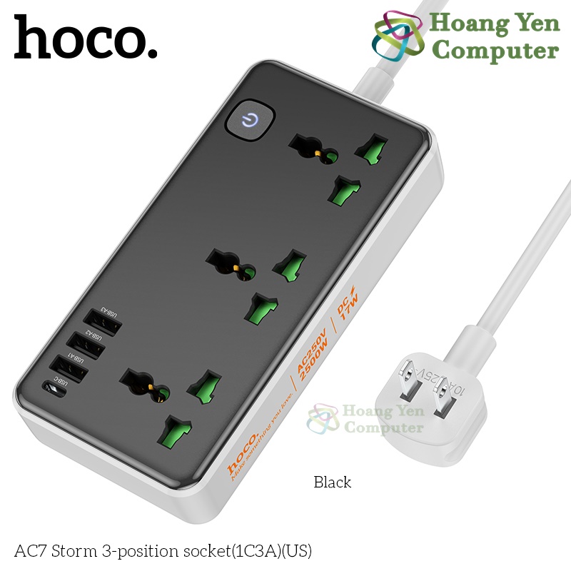 Ổ Điện Đa Năng Hoco AC7 – 3 Ổ Cắm + 1 Cổng Type-C + 3 USB, Công Suất 2500W (Chuẩn US) – BH 1 Năm – Hoàng Yến Computer