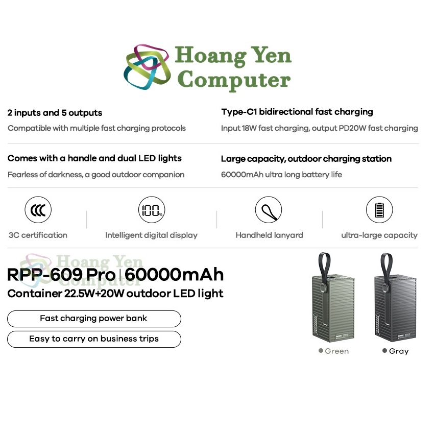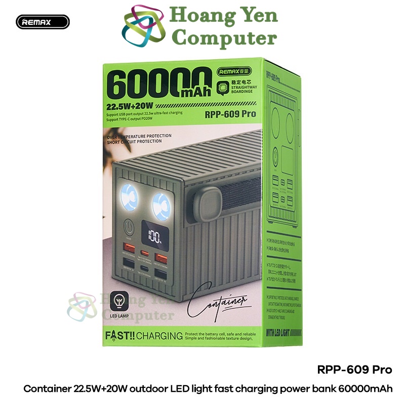 Pin Dự Phòng Remax RPP-609 Pro 60000mAh Sạc Nhanh PD20W QC22, Tích Hợp Đèn LED, Màn Hình Hiển Thị - Hoàng Yến Computer