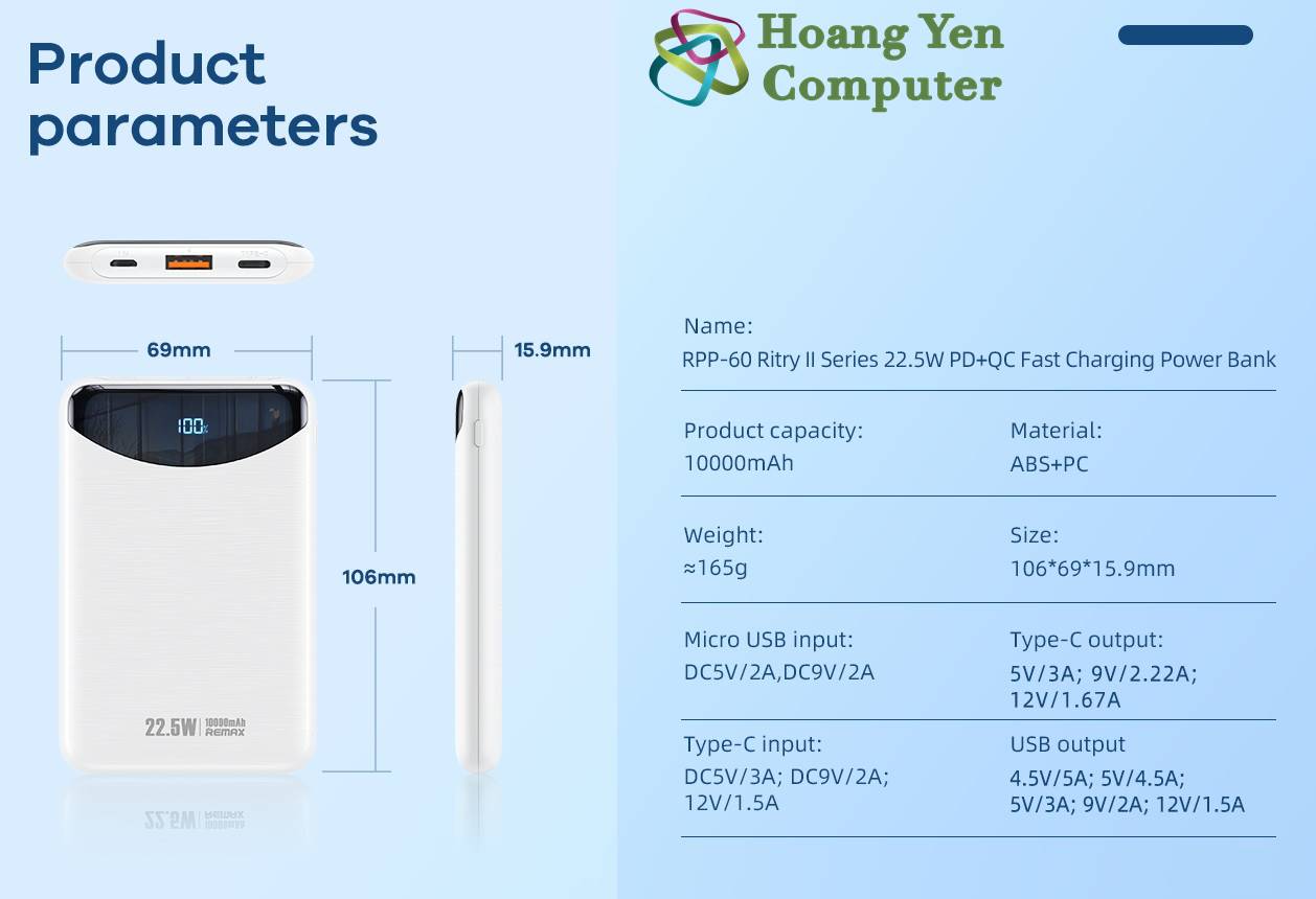 Sạc Dự Phòng Mini Remax RPP-60 10000Mah (Sạc Nhanh QC3.0 18W, 22.5W, PD20W, VOOC 2.0) - BH 1 Năm - Hoàng Yến Computer