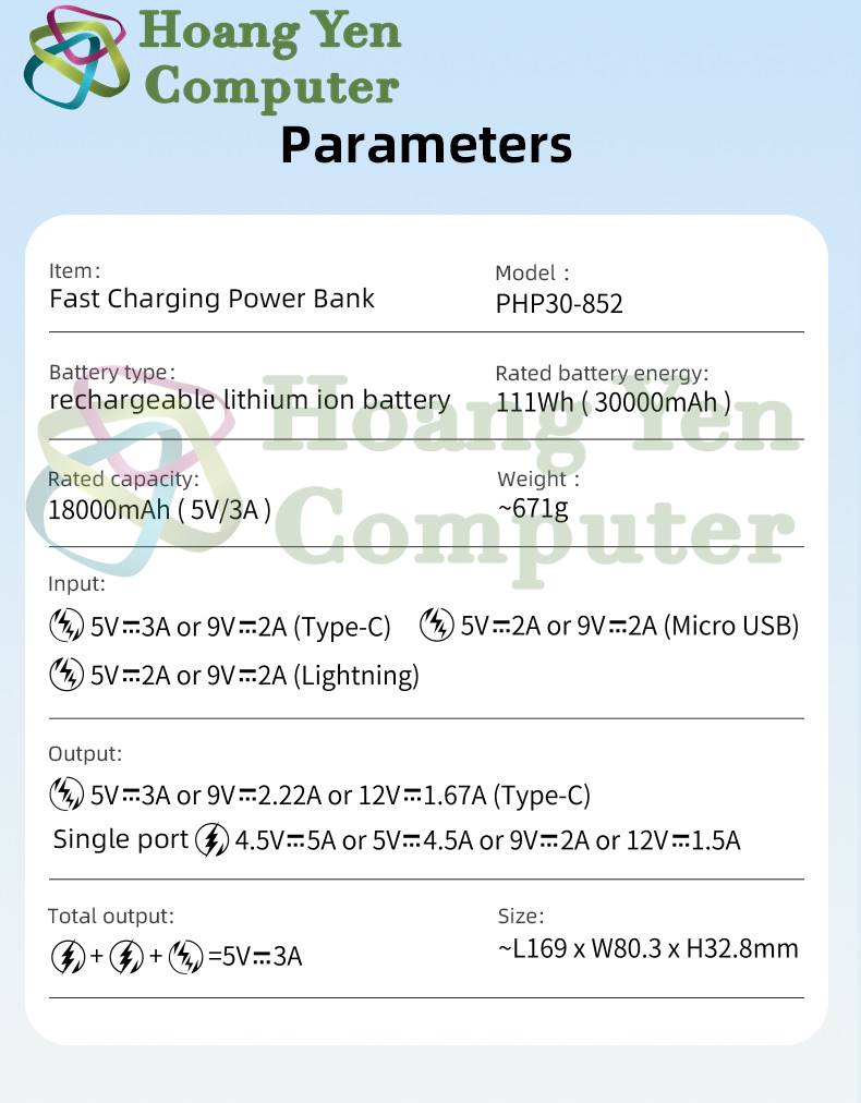 + Output: Type-C : 5V- 3A hoặc 9V - 2.22A hoặc 12V - 1.67A,